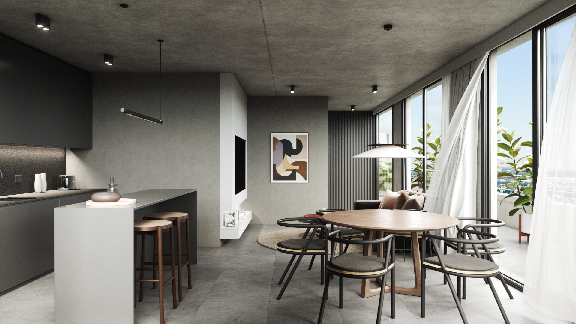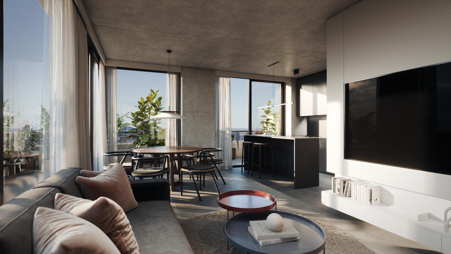 Cada departamento destaca por sus terminaciones de alta calidad, con grandes ventanales que ofrecen vistas privilegiadas, algunas de ellas con panorámicas hacia el río. La distribución y diseño de los espacios ha sido planificada para optimizar la comodidad y calidad de vida de sus residentes.